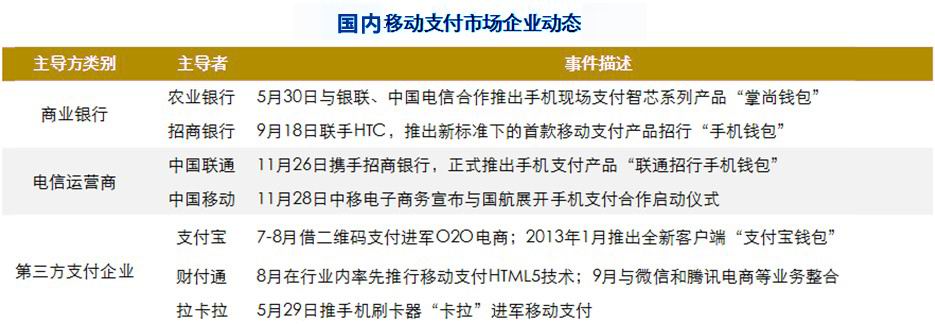 第三方支付提供商主要是借助手機的移動上網(wǎng)功能實現(xiàn)隨時隨地?zé)o線支付,支付寶、財付通、拉卡拉,以及即將面市的微信支付等都是第三方支付提供高的代表。早在2009年支付寶推出手機客戶端軟件,后與十多家銀行合作推出快捷支付。近期,財付通聯(lián)合微信即將推出二維碼微信支付 。