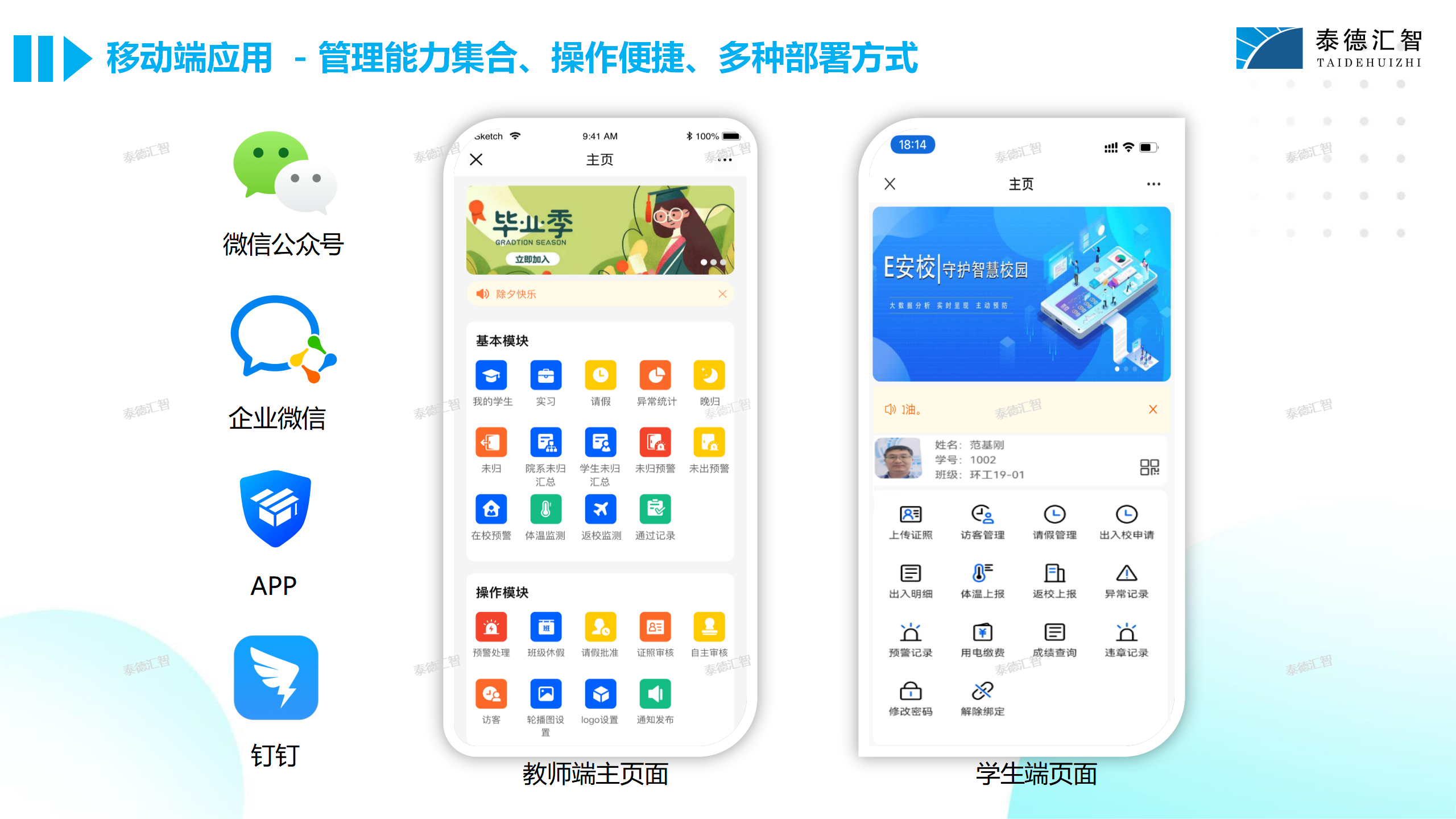 - 多端協(xié)同便捷管理:支持PC端、移動(dòng)端(微信、企業(yè)微信、釘釘)多渠道部署,請(qǐng)假審批、訪客管理、預(yù)警處理等功能隨時(shí)操作,管理無邊界。