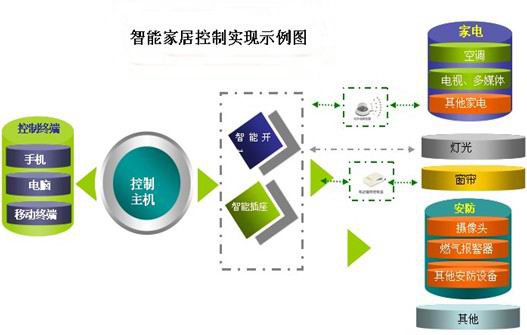 從圖中可以看出,用戶通過(guò)操作控制終端實(shí)現(xiàn)家電控制、照明控制、窗簾控制、電話遠(yuǎn)程控制、室內(nèi)外遙控、防盜報(bào)警、環(huán)境監(jiān)測(cè)、暖通控制等多種功能。而這些功能都是通過(guò)智能家居系統(tǒng)中的核心部件“控制主機(jī)”把家中的各種設(shè)備(如音視頻設(shè)備、照明系統(tǒng)、窗簾控制、空調(diào)控制、安防系統(tǒng)、數(shù)字影院系統(tǒng)、網(wǎng)絡(luò)家電以及三表抄送等)實(shí)現(xiàn)連接并控制的。 |